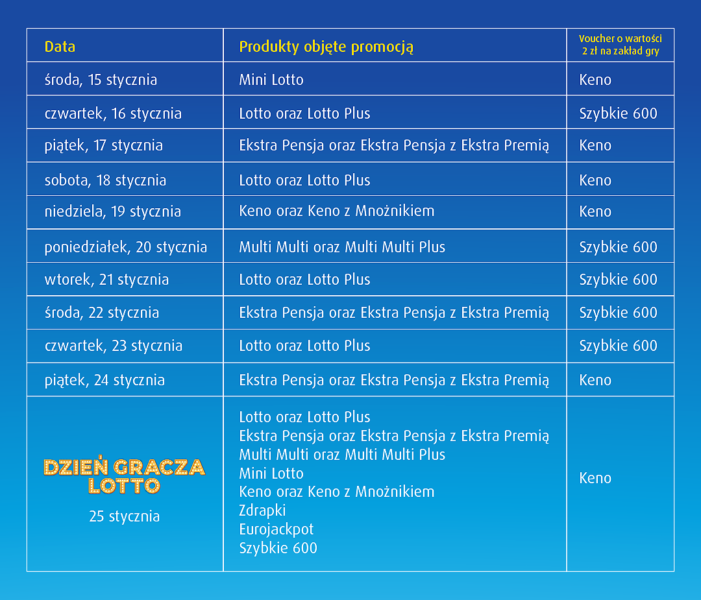 Z okazji Dnia Gracza, Totalizator Sportowy przygotował dodatkowe niespodzianki. Od 15 do 25 stycznia, za zakupy produktów LOTTO powyżej 24 zł, gracze otrzymają voucher lub bonus kwotowy na darmowy zakład na Szybkie 600 lub Keno.