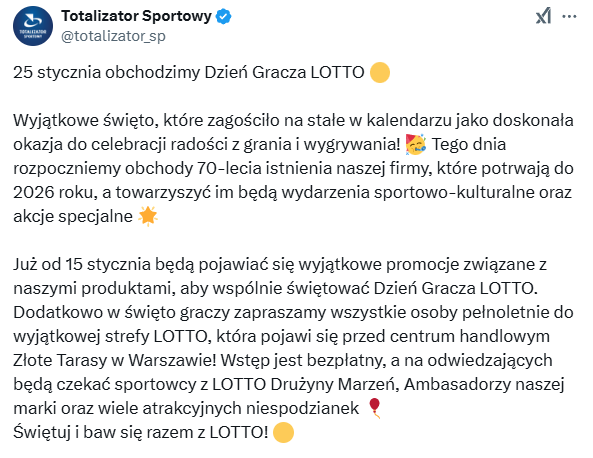 Dzień Gracza LOTTO to również początek obchodów 70-lecia Totalizatora Sportowego. Na graczy czekają atrakcje w kolekturach, aplikacjach online oraz wydarzenia kulturalne i sportowe.