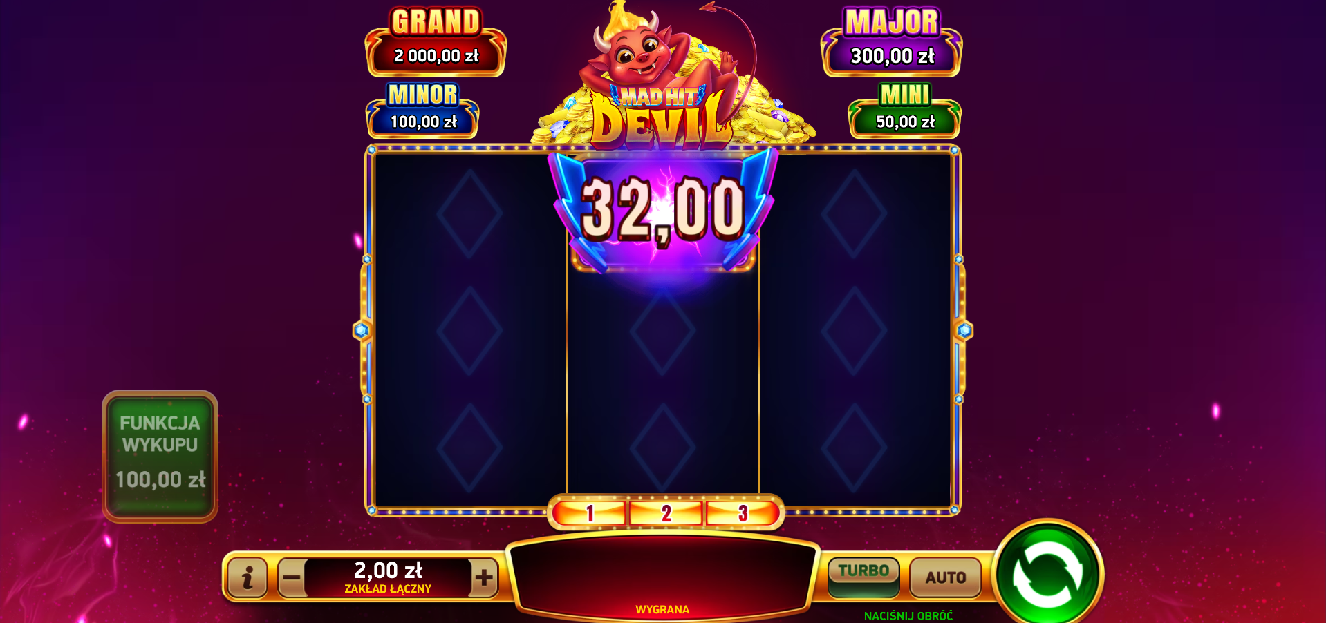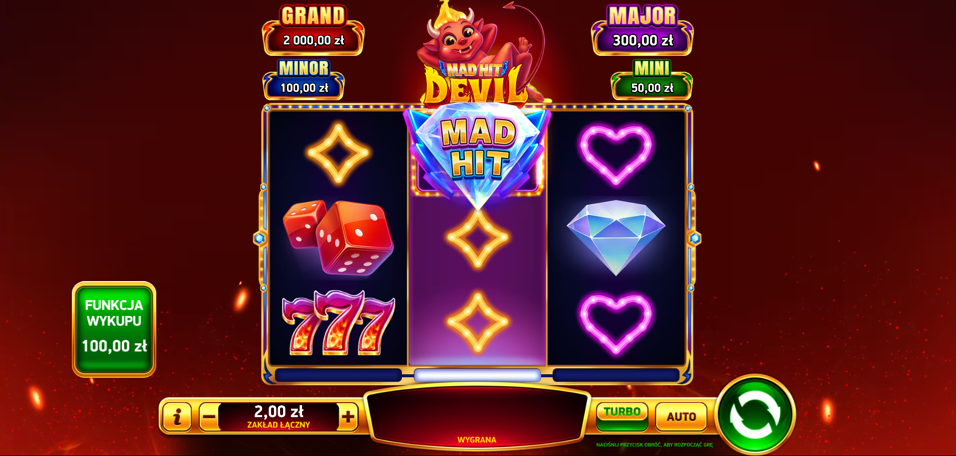 Symbol Mad Hit ląduje tylko na bębnie 2 i uruchamia trzy funkcje: