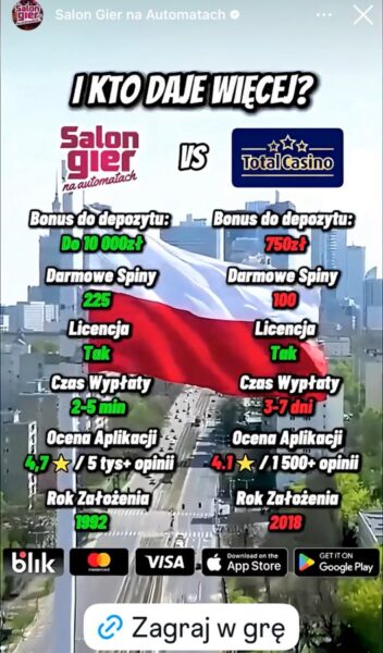 Nowe reklamy na Instagram Stories prezentują zestawienie „Salonu Gier na Automatach” z Total Casino, zbudowane w formie porównawczej grafiki sugerującej równorzędność obu podmiotów. Po kliknięciu reklama prowadzi najpierw do PWA, a następnie na stronę nielegalnego operatora offshore, co przypomina wcześniejsze schematy wykorzystujące podobne przekierowania. To już kolejny w tym roku przypadek, w którym nielegalny operator podszywa się pod markę Total Casino, co wcześniej opisywaliśmy przy okazji innej kampanii imitującej wizualnie legalnego monopolistę.