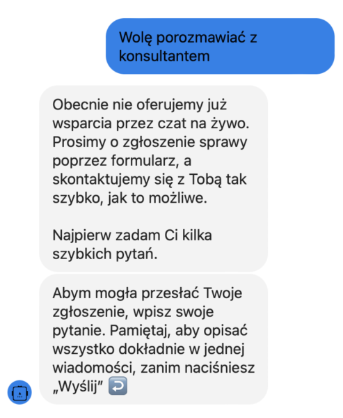 Jedyną możliwością uzyskania pomocy jest skorzystanie z formularza kontaktowego, jednak czas oczekiwania na zapytania przesłane w tej formie jest z reguły o wiele dłuższy niż w przypadku czatu z konsultantem,