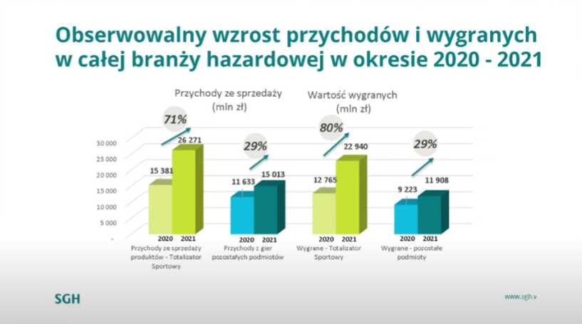 Rumiana Górska przedstawiła także szereg innych wykresów, w tym tak ważnych, jak obserwowalny wzrost przychodów i wygranych w całej branży hazardowej w okresie 2020 – 2021.